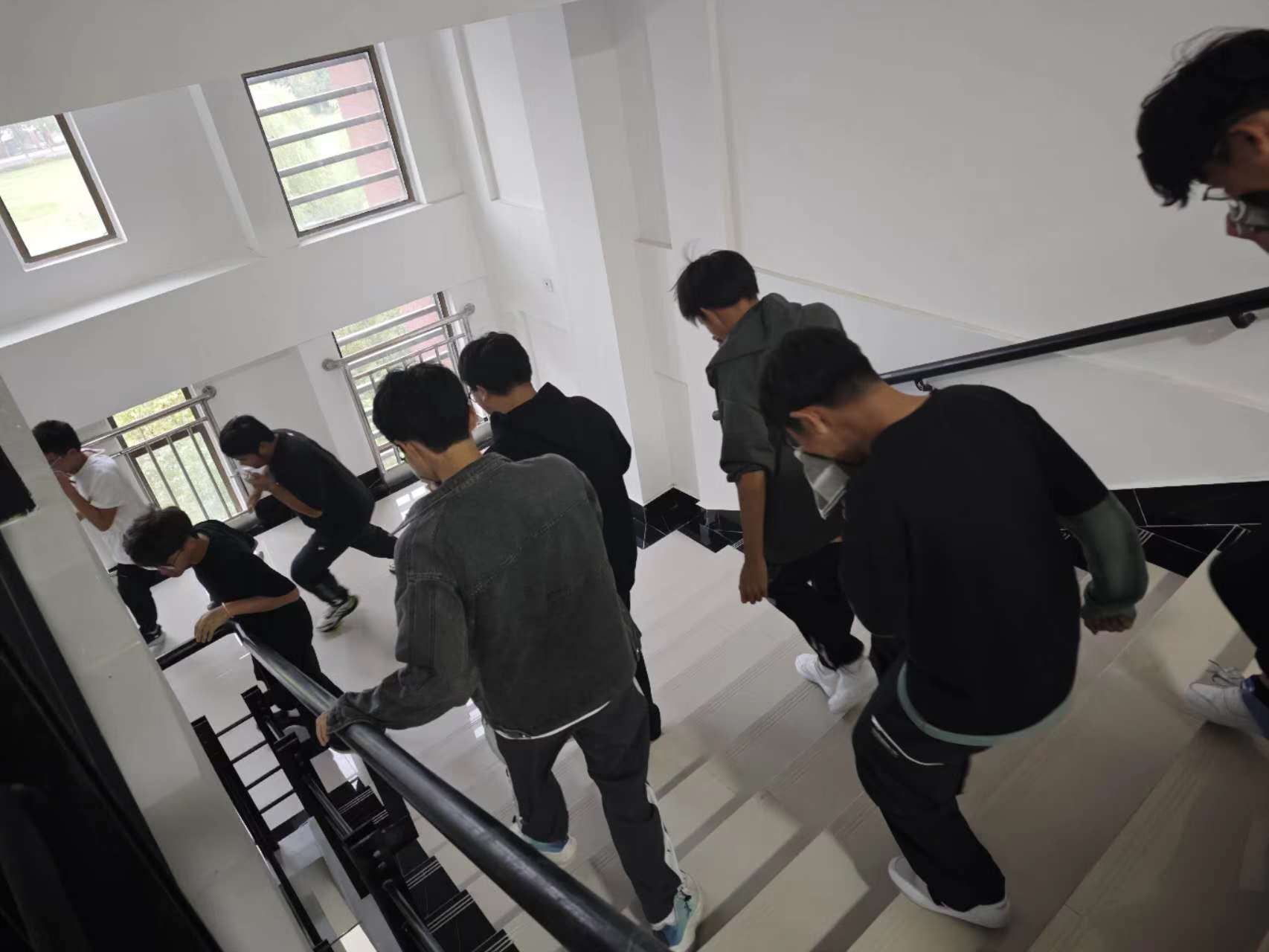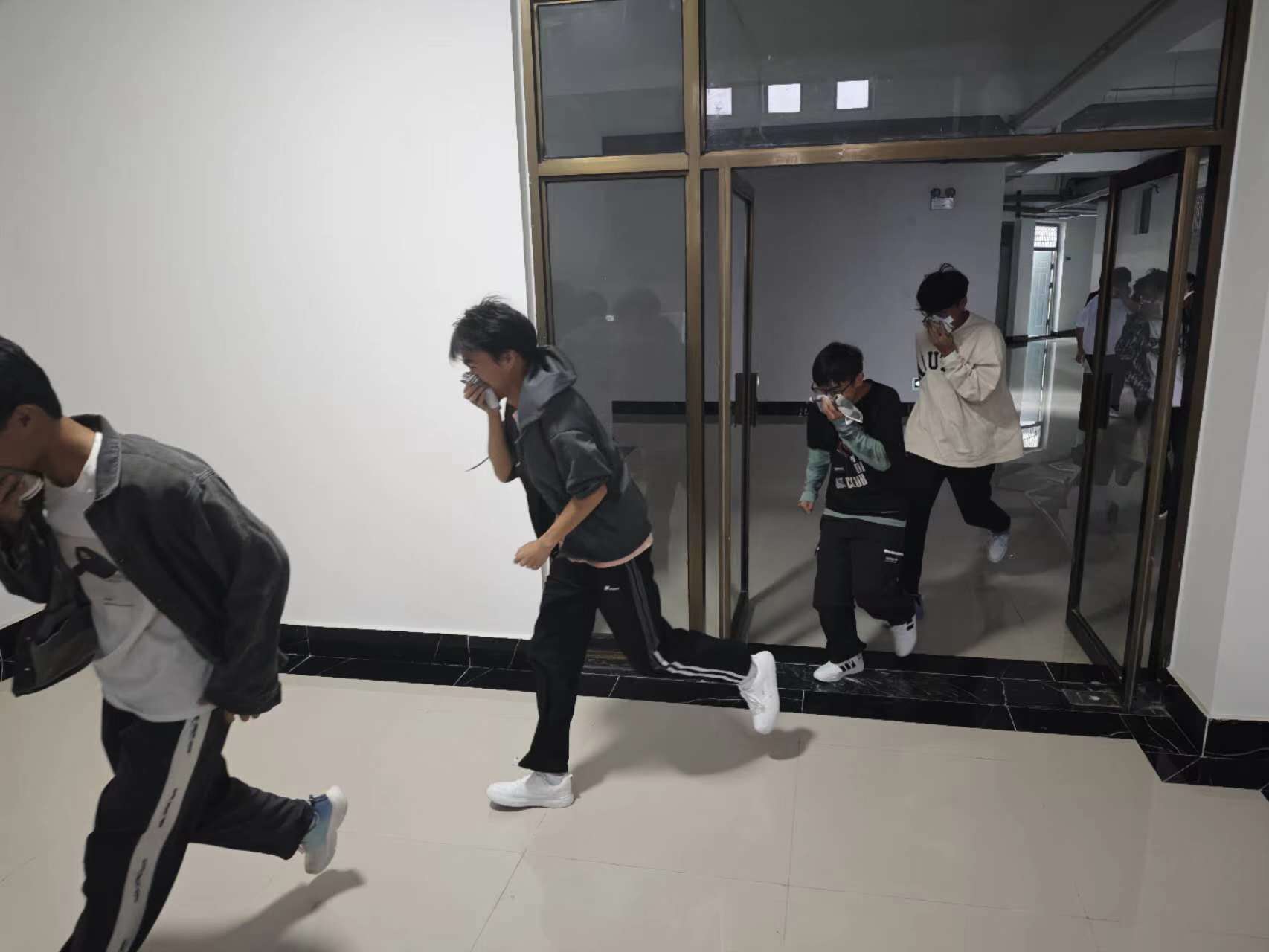 在戎李的指导下,参会师生开展了逃生疏散路线的演练。此次演练旨在通过模拟真实场景,让师生们亲身体验并掌握在紧急情况下正确、快速逃生的方法和技巧。在整个过程中,大家严格按照演练要求,低姿前行,用湿毛巾捂住口鼻,尽量避免吸入有害气体。整个演练过程紧张而有序,师生们表现出良好的安全素养和应急反应能力。
