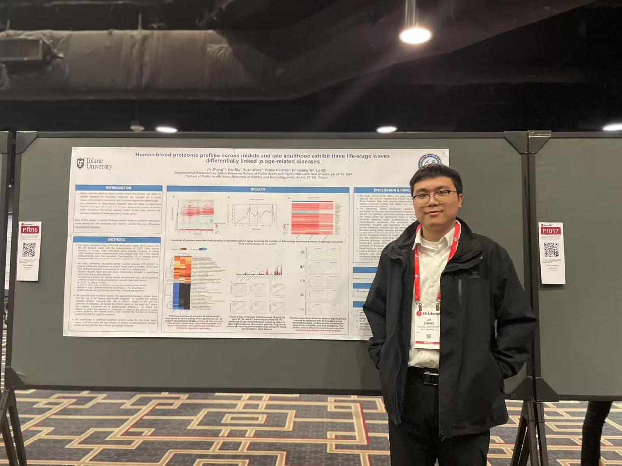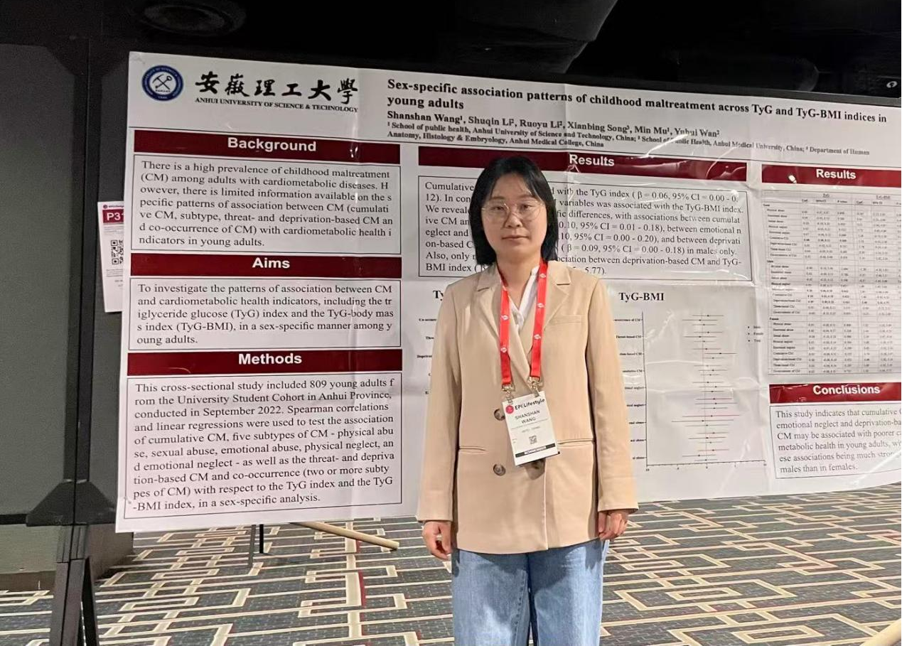 学院汪姗姗老师以《Sex-specific association patterns of childhood maltreatment across TyG and TyG-BMI indices in young adults》为题进行壁报展示,聚焦童年虐待经历与青年人群代谢指标的性别特异性关联,其研究视角为解析早期生活经历对健康的长期影响提供了新证据。学院张杰博士通过《Human blood proteome profles across middle and late adulthood exhibit three life-stage waves diferentially linked to age-related diseases》及《Cardiovascular Health Levels and Incident Cardiovascular Event Risk Among Individuals with Autoimmune Diseases》两项壁报展示,分别从血液蛋白质组学、自身免疫疾病人群心血管健康风险等角度展开研究,展现了对衰老相关疾病及特殊人群心血管健康的深入探索。