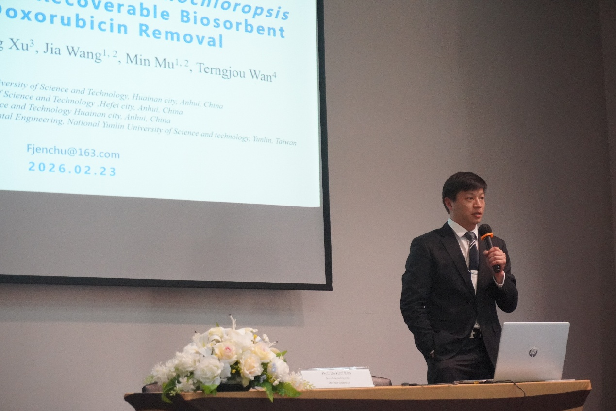 我院教师参会代表作了题为“Fe₃O₄-FunctionalizedNannochloropsis gaditanaas a Recoverable Biosorbent for Doxorubicin Removal”的学术报告。报告聚焦功能化微藻材料在抗生素药物污染物去除中的应用潜力,介绍以Fe₃O₄功能化小球藻微藻生物吸附材料实现对医疗事业废水抗生素高效去除与可回收利用的研究思路。该研究契合公共卫生与环境治理发展功能材料与资源化利用的核心议题。与会专家对理工医交叉融合在公共卫生议题新污染物治理及环境应用拓展方面所展现出的创新性与应用给予积极评价,认为该成果在可回收生物吸附材料构建及医药污染物高效去除方面具有较好的推广潜力。