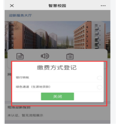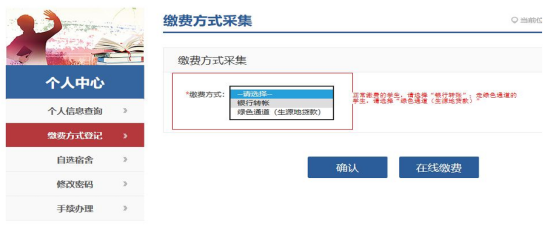 其二是“绿色通道(生源地贷款)”,选择走绿色通道(生源地贷款),如有生源地贷款的学生等,请选择此方式。(注:两种缴费方式,只能选择其中一种,且确定之后无法更改!不在迎新系统完成缴费将造成无法自选宿舍(床位)。)