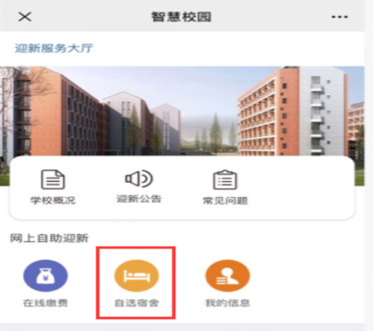5、在线缴费成功后,点击“自选宿舍”,进行宿舍选择(注:如在选择宿舍前,没有进行费用缴纳,无法选择宿舍)