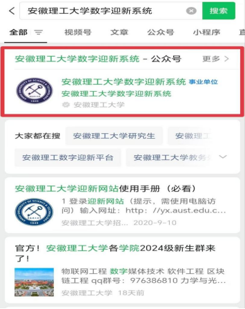 1.在微信中搜索“安徽理工大学数字迎新系统”,关注该微信公众号