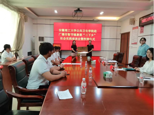 7月10日,广德团市委、誓节镇领导与安徽理工大学公共卫生学院“仁卫”志愿者服务队在誓节镇政府大楼会议室举行了2024年安徽理工大学暑期三下乡社会实践座谈会暨“安徽理工大学美育实践基地”授牌仪式。