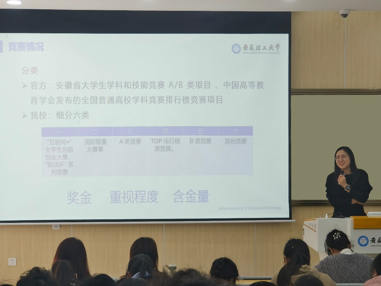 分享会在耕心楼101举行,朱峰林老师围绕竞赛情况、竞赛益处、竞赛支持、学生参与这四个方面展开分享。她以竞赛分类作为切入点,详细阐述了各类竞赛的参与途径、难易状况、侧重点等内容,为同学们参与竞赛提供了方向指引,帮助大家更有针对性地选择适合自己的竞赛项目。另外,朱峰林老师介绍了其指导学生在学术竞赛中屡获佳绩的经验以及所取得的优秀成果。
