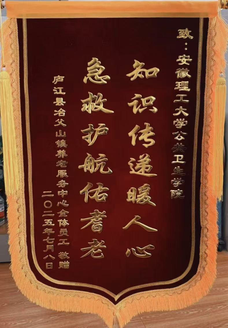 (图为2025年7月8日庐江县冶父山镇养老服务中心寄往公共卫生学院的感谢信和锦旗)