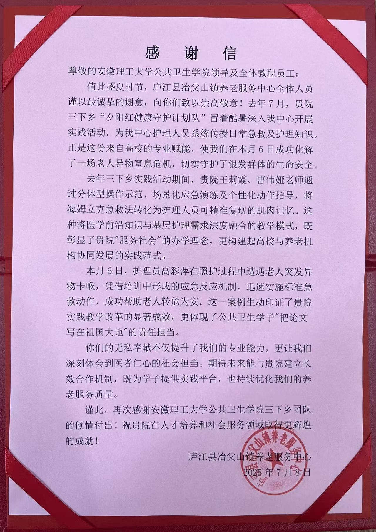 2025年7月8日,安徽理工大学公共卫生学院收到庐江县冶父山镇养老服务中心寄来的感谢信与锦旗。信中详细回顾了学院“夕阳红健康守护计划队”在2024年暑期“三下乡”活动中为养老院护理人员开展急救培训的经过,并重点提及今年7月6日发生的紧急事件:一名老人因异物卡喉生命垂危,曾参与培训的护理员高彩萍凭借所学急救技能,通过海姆立克急救法成功施救,助其转危为安。