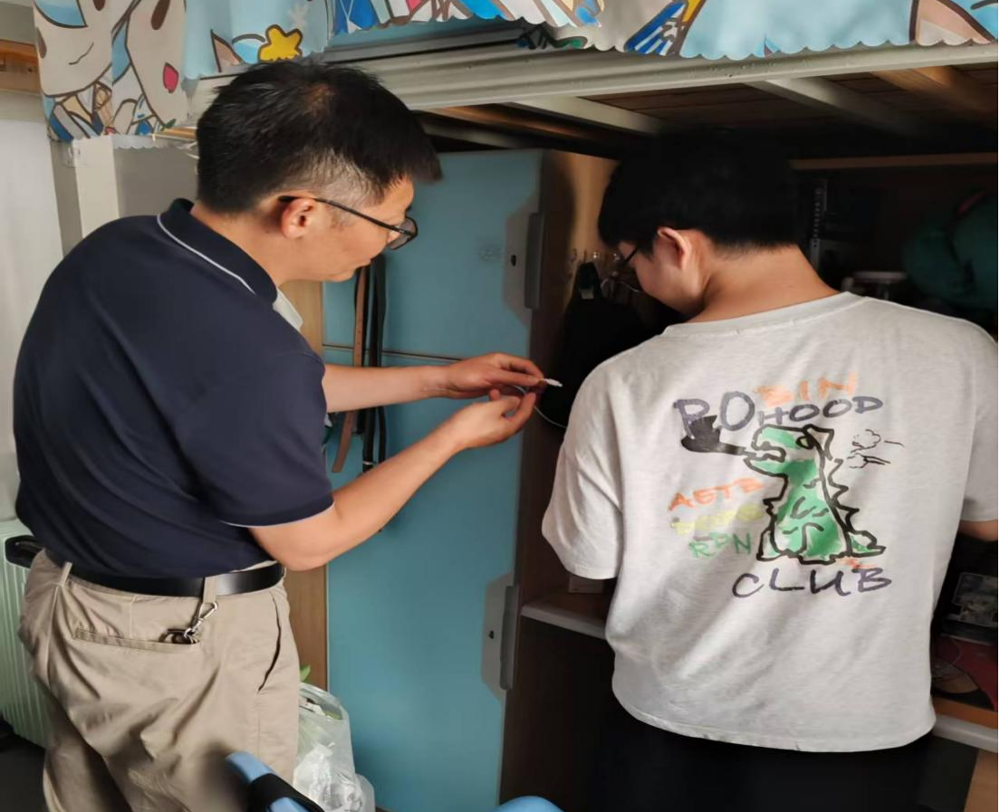 宿舍安全检查过程中,2023级辅导员秦飞、2024级辅导员薛敏逐一走进学生宿舍,查看是否违规使用大功率电器、插线板是否老化,针对私拉电线、杂物堆积等问题,两位辅导员现场提出整改意见并明确整改时限。同时检查内务整理、垃圾处理等情况。此次检查既消除了安全隐患,也帮助学生养成良好的生活习惯,营造了“安全第一、整洁有序”的宿舍环境。