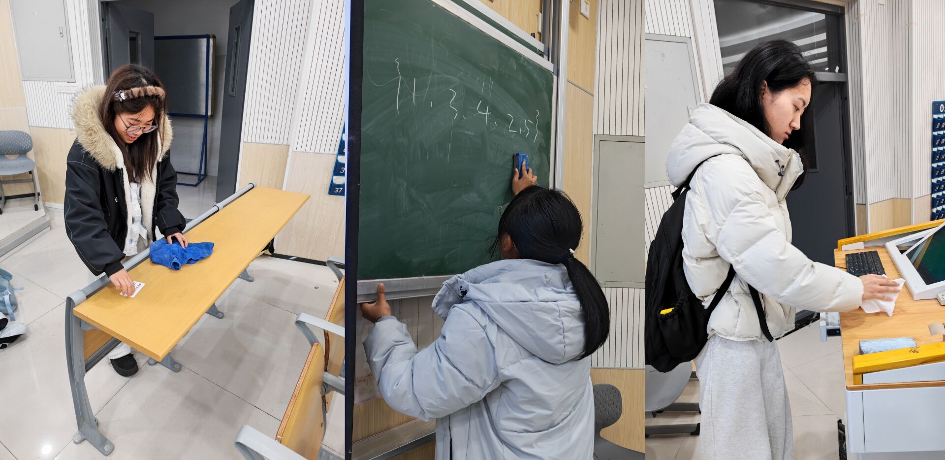 3月17日,学院各班级团支部组织志愿者聚焦学校耕心楼,开展“精细化”清洁志愿服务活动。志愿者们分组清理粉笔灰,擦拭黑板槽、讲台、多媒体设备控制台等易积尘区域,让教学环境焕然一新。