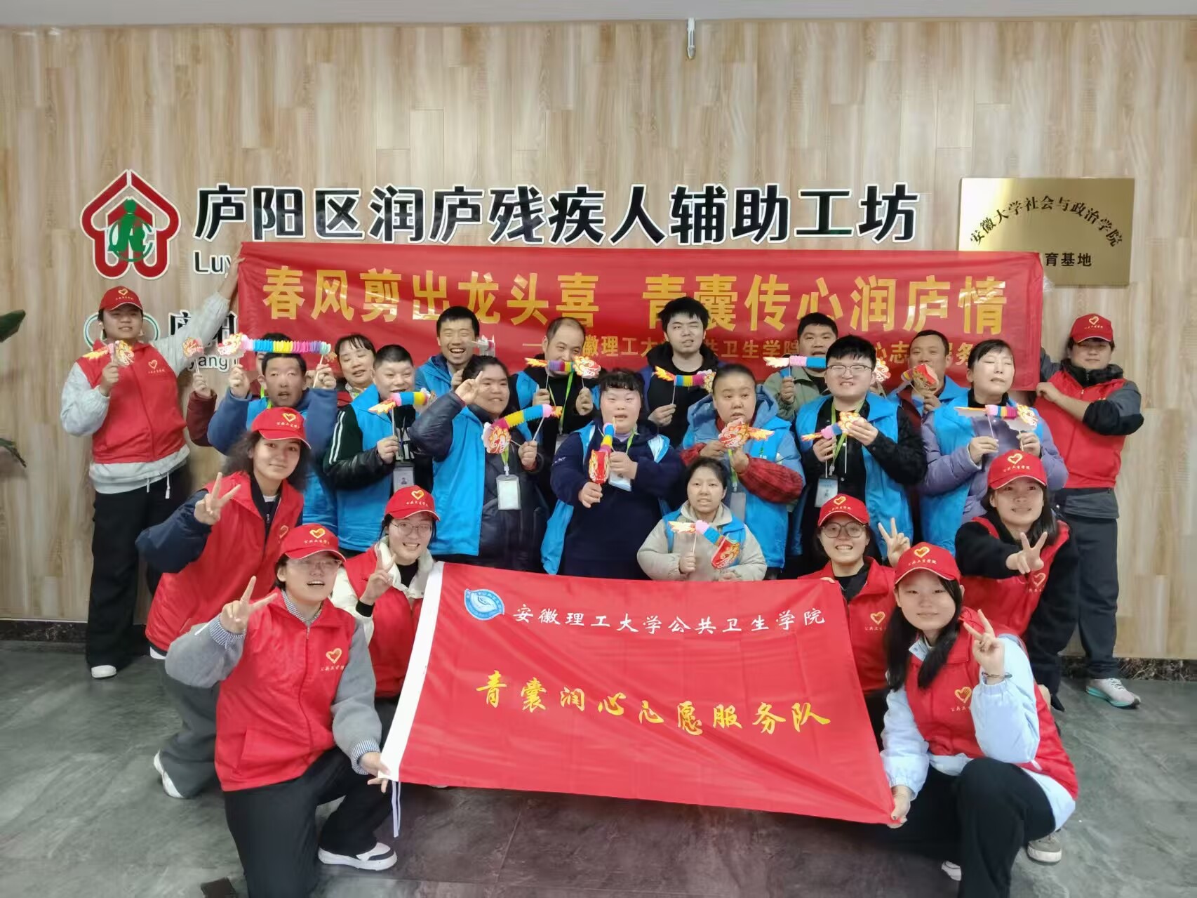 春风和煦,志愿同行。为弘扬雷锋精神,丰富残疾人群体精神文化生活,3月18日至20日,安徽理工大学公共卫生学院“青囊润心”志愿服务队走进合肥市庐阳区润庐残疾人辅助工坊,深度参与工坊主办的“二月二龙抬头”民俗体验与“书声琅琅春深处”经典诵读活动,让特殊群体在春日里尽享传统文化魅力与人文关怀。