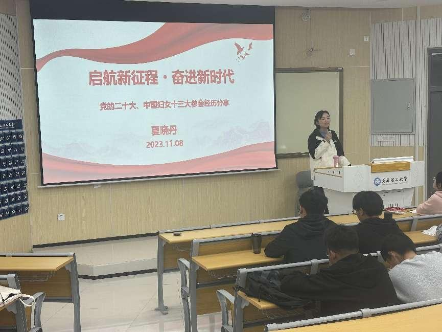 为进一步学习贯彻习近平新时代中国特色社会主义思想,落实“关于面向广大团员和青年开展学习贯彻习近平新时代中国特色社会主义思想主题教育”的部署要求,11月8日,学院党委副书记夏晓丹结合自身参加党的二十大、中国妇女十三大的参会经历和感悟,特别围绕二十大报告的新观点,新论断和新思想,对党的二十大精神进行了深入阐述解读,全面、准确、详实的解读了党的二十大提出的一系列新的重要思想、重要观点、重大战略、重大举措,2023级全体新生倾听了宣讲。